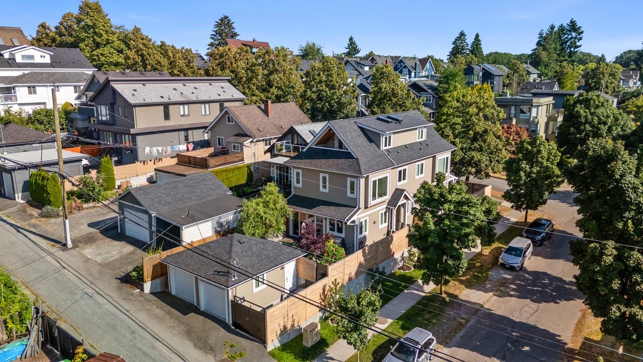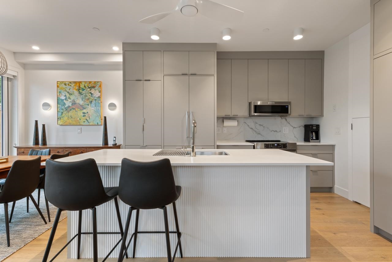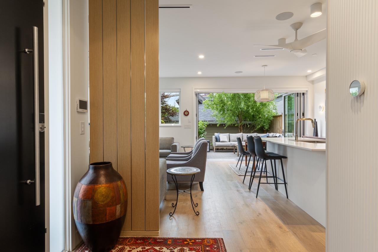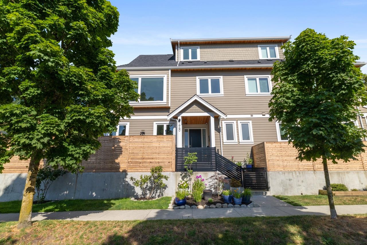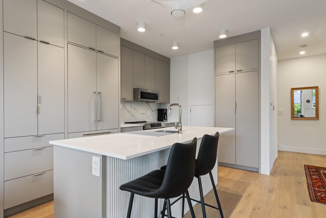 Perched up off the street on a private corner lot, this stunning home lives like a detached house. The main floor has a bright, open plan featuring a living area w/ custom built-ins, stylish powder room w/ Bocci lighting, impressive chef’s kitchen w/ induction range, large island with bar seating and integrated fridge/dishwasher & dining area offering seamless indoor-outdoor flow via 12’ accordion doors to lush the garden & patio. Upstairs has 2 bedrooms incl the stunning primary retreat w/ ample closet space & dreamy ensuite. The top floor bedroom offers a covered balcony, 3pc ensuite & panoramic views. Sophisticated interiors include white oak floors, radiant heat, A/C, Nest system, in-ceiling speakers and custom millwork. Includes a single car garage + bonus secure parking pad. Wow!