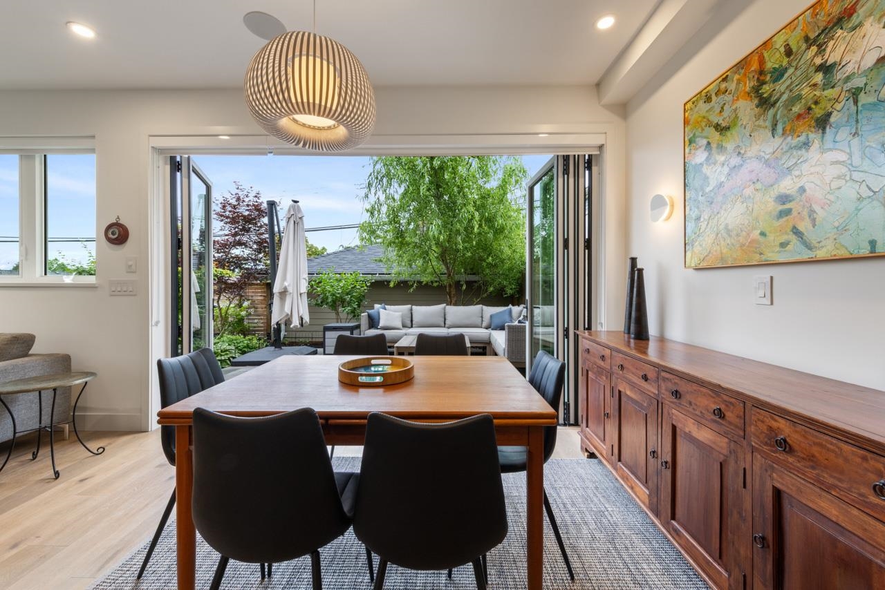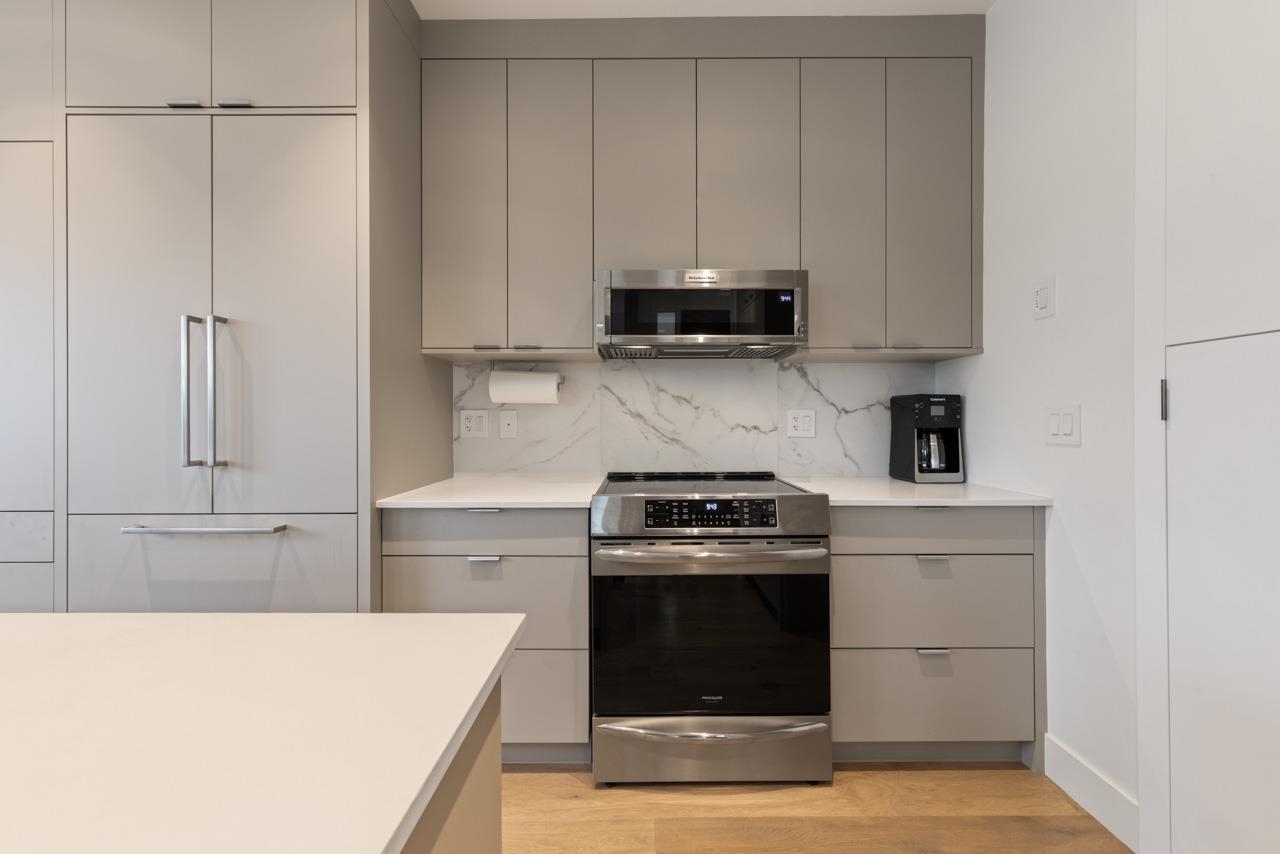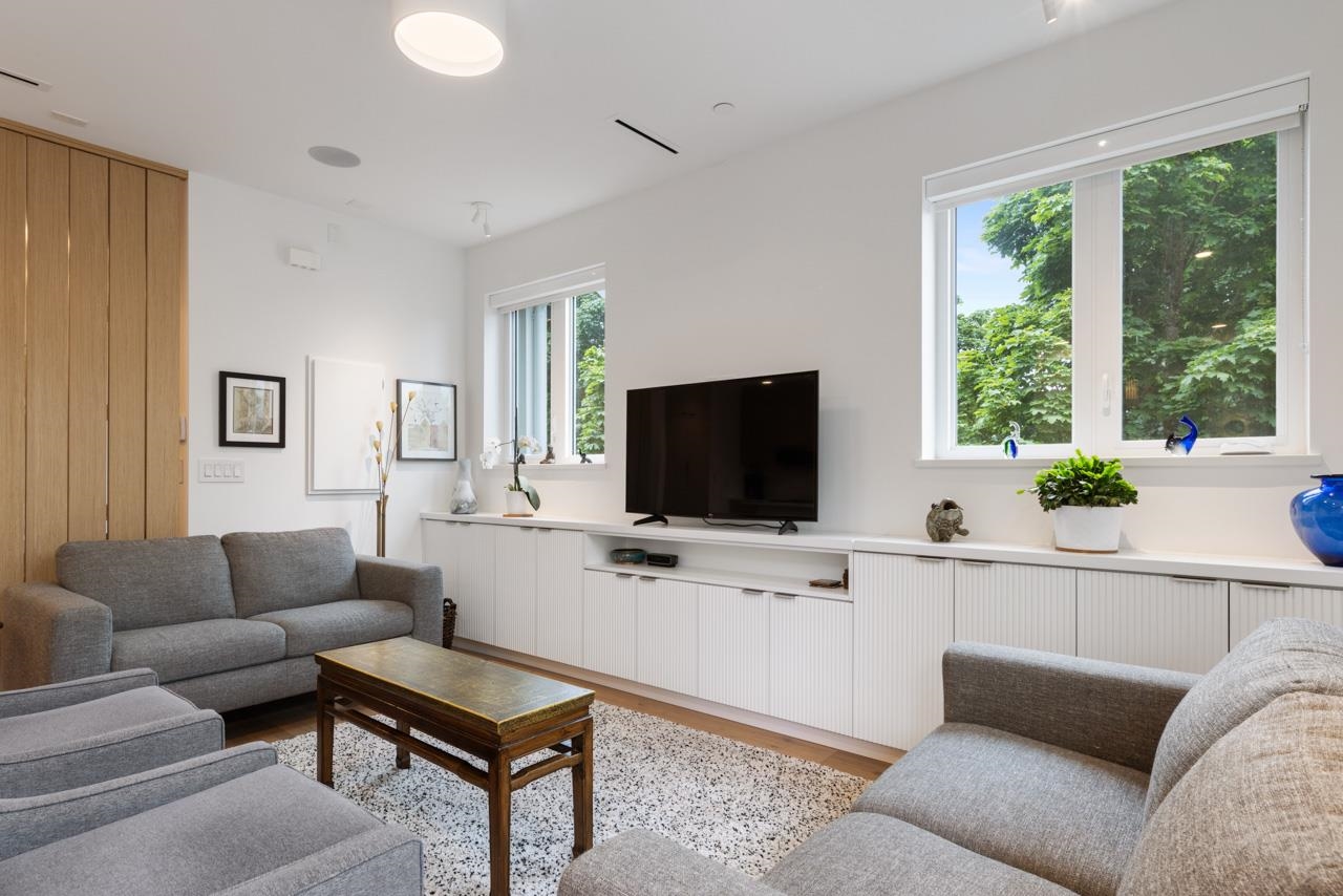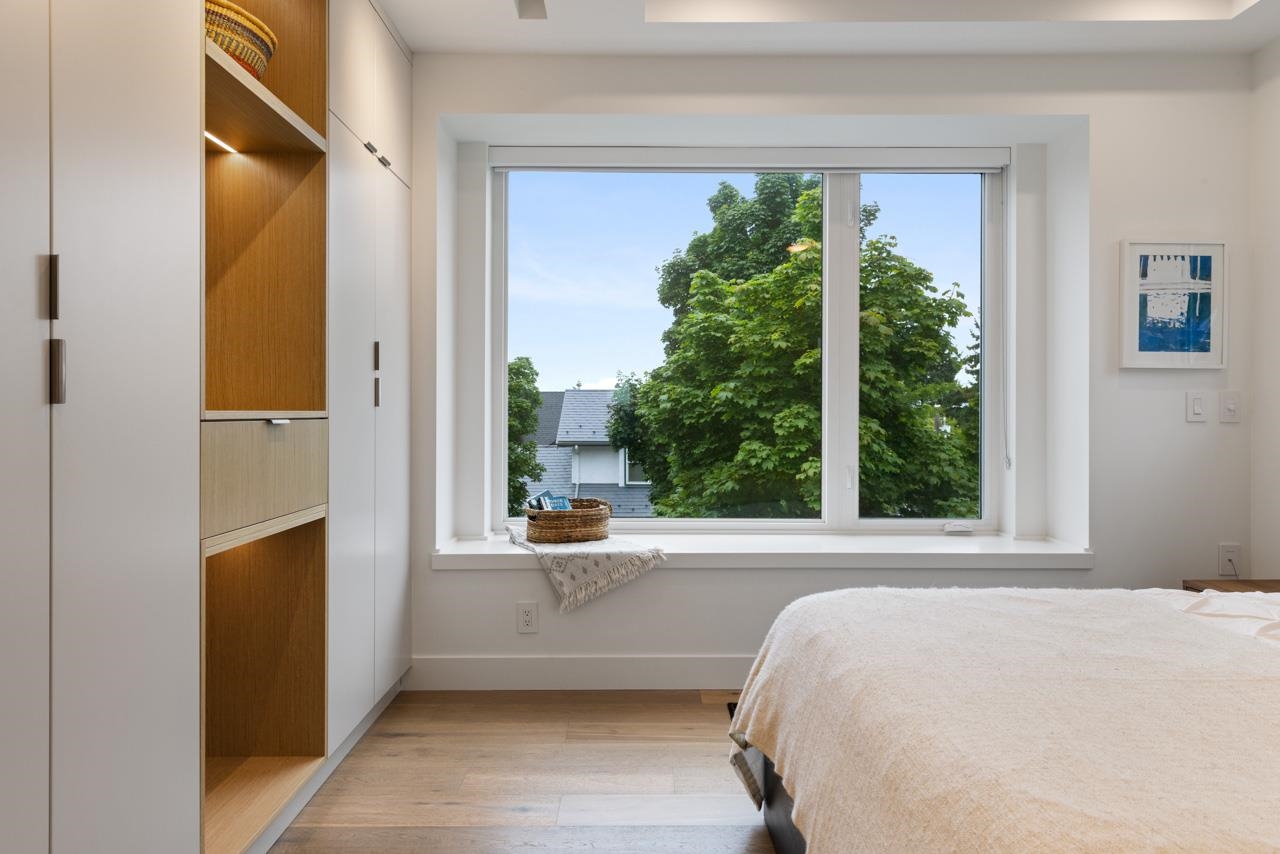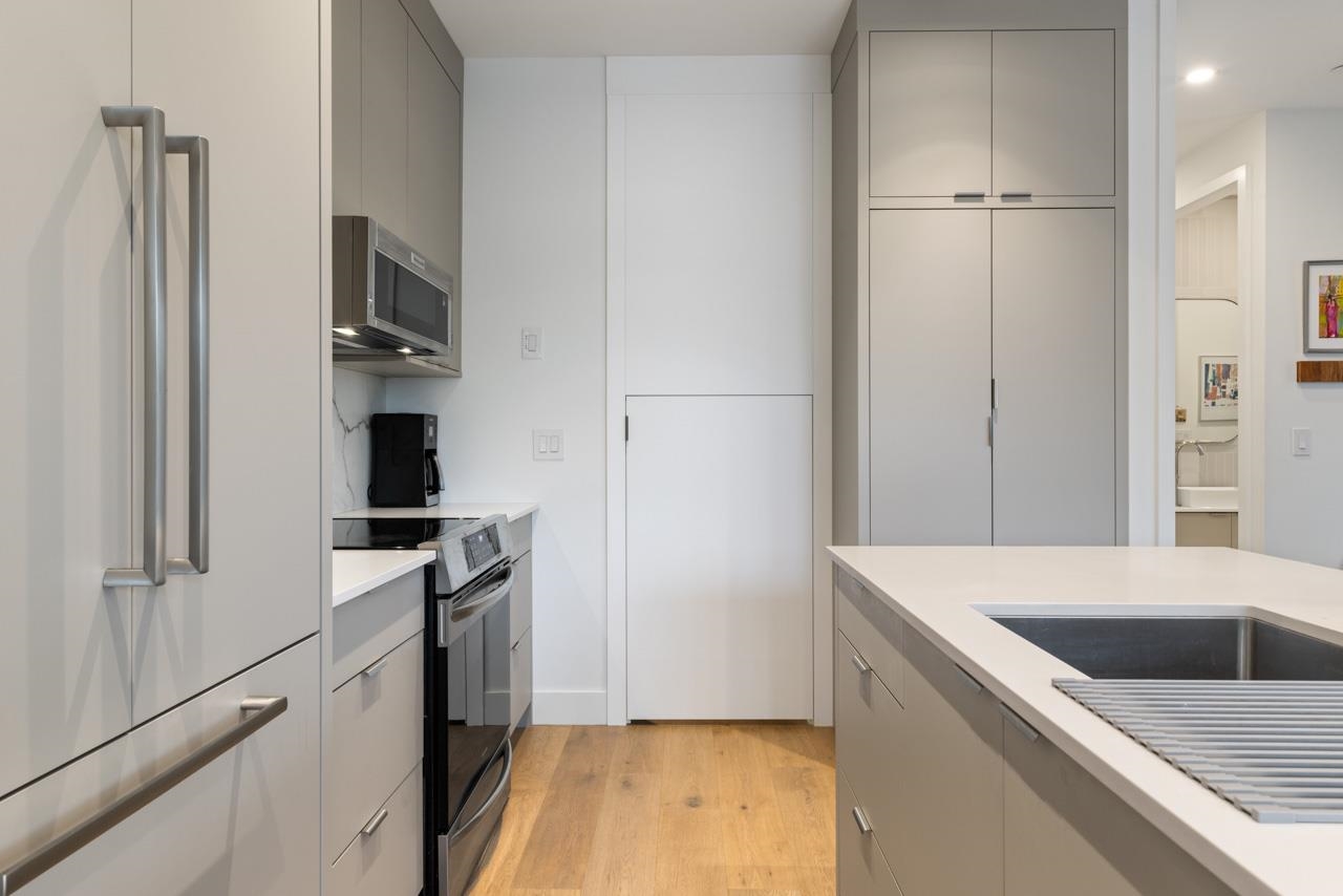 Perched up off the street on a private corner lot, this stunning home lives like a detached house. The main floor has a bright, open plan featuring a living area w/ custom built-ins, stylish powder room w/ Bocci lighting, impressive chef’s kitchen w/ induction range, large island with bar seating and integrated fridge/dishwasher & dining area offering seamless indoor-outdoor flow via 12’ accordion doors to lush the garden & patio. Upstairs has 2 bedrooms incl the stunning primary retreat w/ ample closet space & dreamy ensuite. The top floor bedroom offers a covered balcony, 3pc ensuite & panoramic views. Sophisticated interiors include white oak floors, radiant heat, A/C, Nest system, in-ceiling speakers and custom millwork. Includes a single car garage + bonus secure parking pad. Wow!