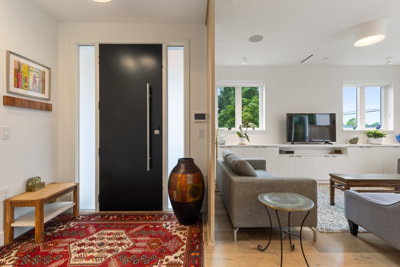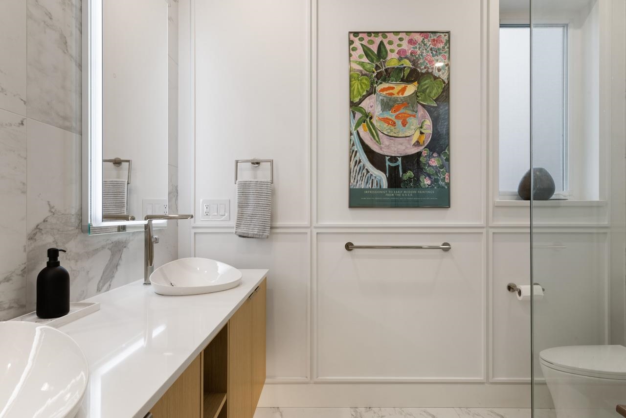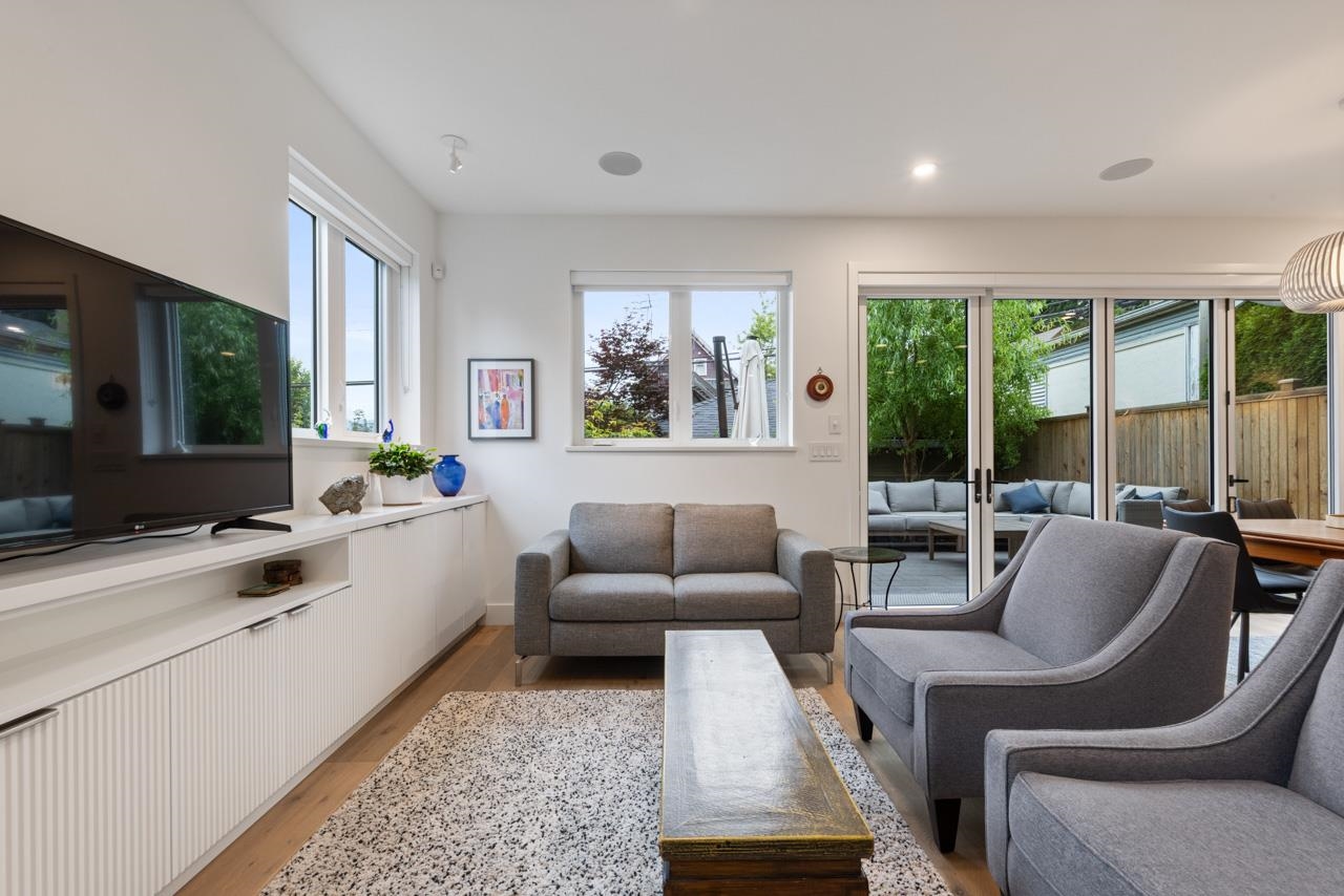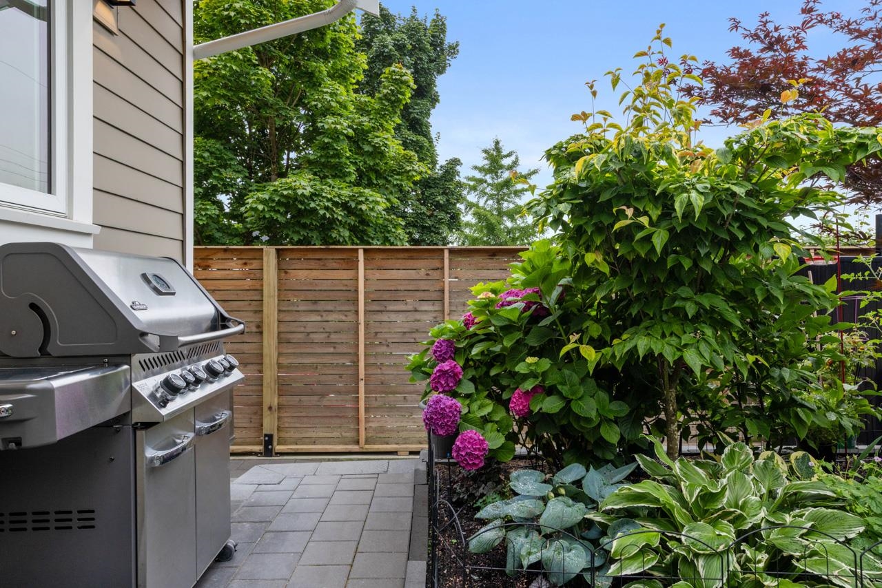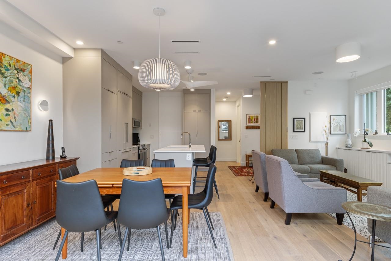 Perched up off the street on a private corner lot, this stunning home lives like a detached house. The main floor has a bright, open plan featuring a living area w/ custom built-ins, stylish powder room w/ Bocci lighting, impressive chef’s kitchen w/ induction range, large island with bar seating and integrated fridge/dishwasher & dining area offering seamless indoor-outdoor flow via 12’ accordion doors to lush the garden & patio. Upstairs has 2 bedrooms incl the stunning primary retreat w/ ample closet space & dreamy ensuite. The top floor bedroom offers a covered balcony, 3pc ensuite & panoramic views. Sophisticated interiors include white oak floors, radiant heat, A/C, Nest system, in-ceiling speakers and custom millwork. Includes a single car garage + bonus secure parking pad. Wow!
