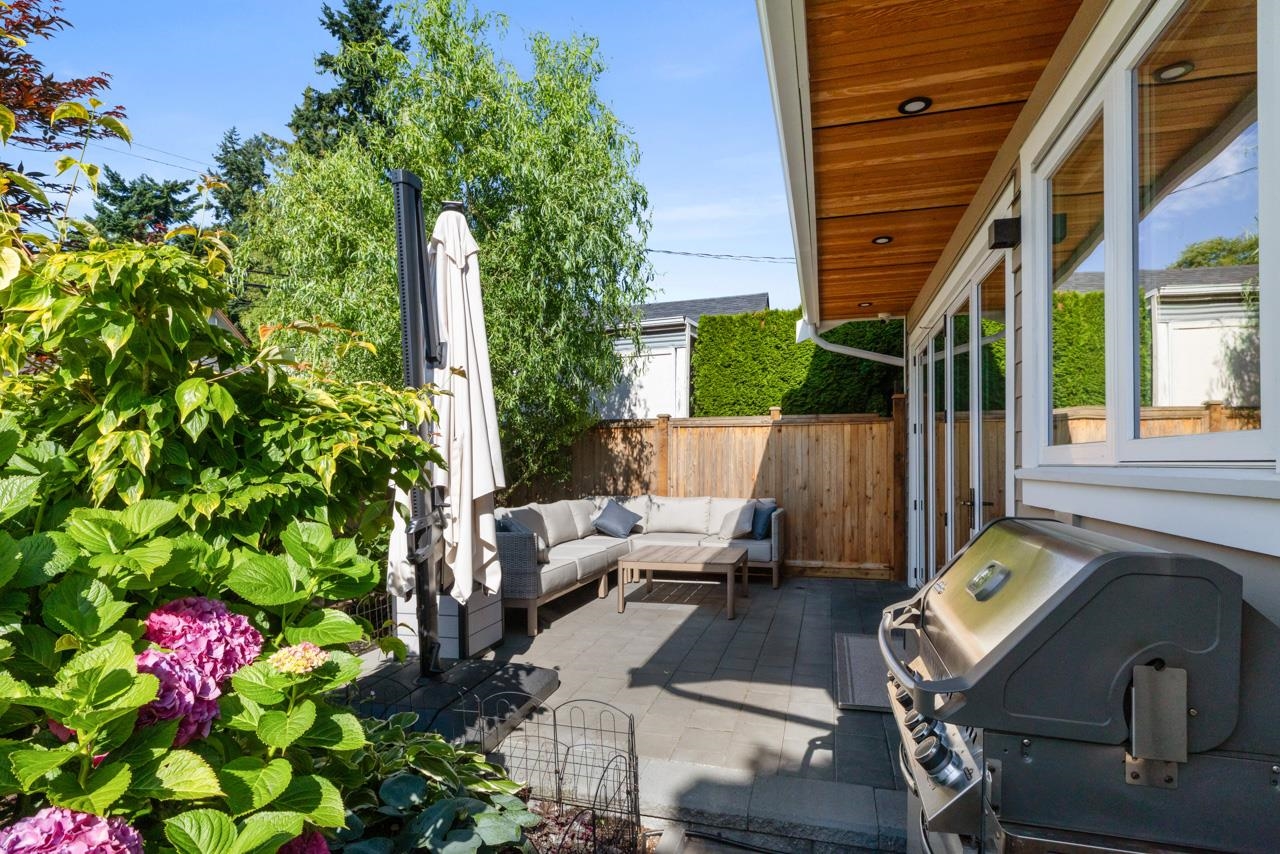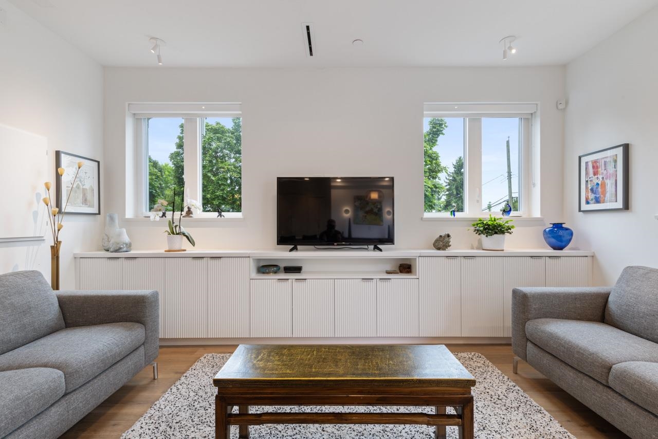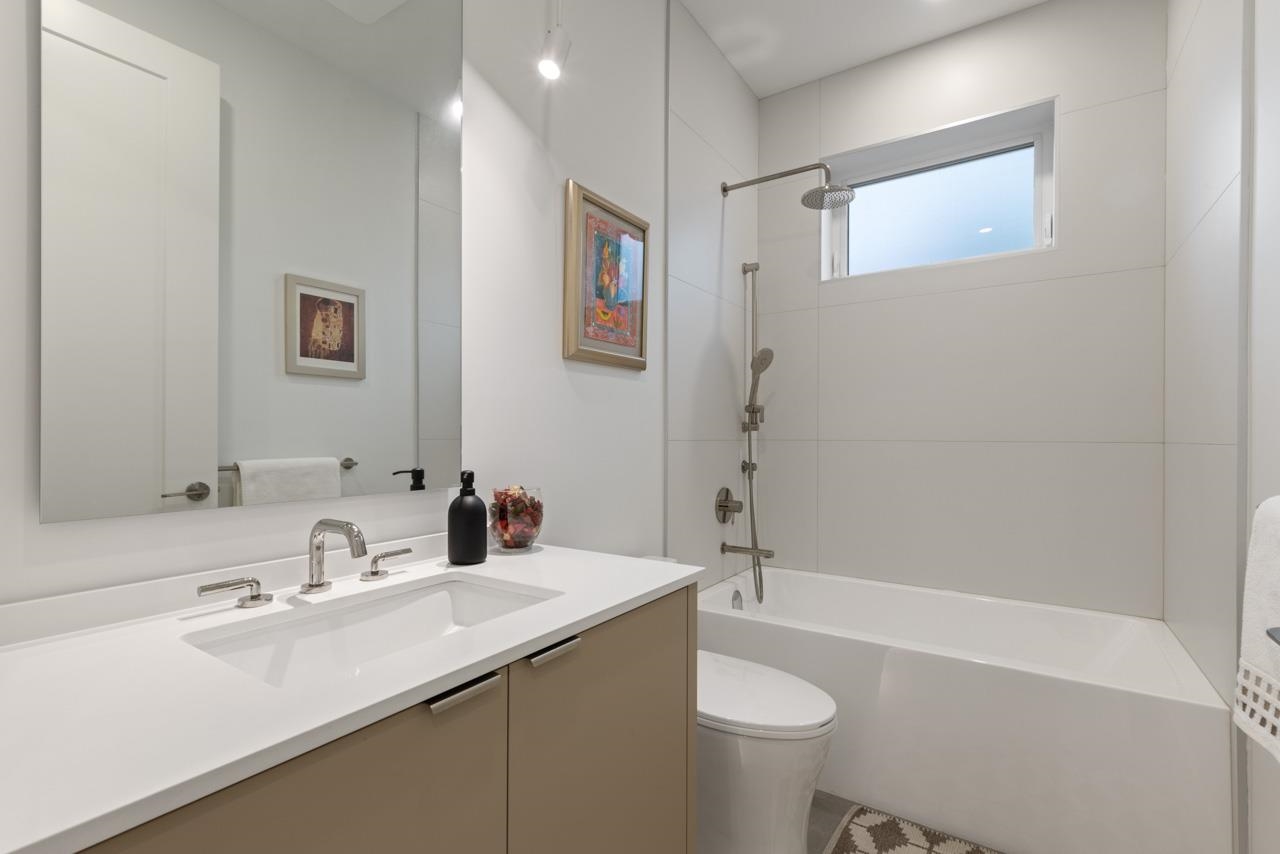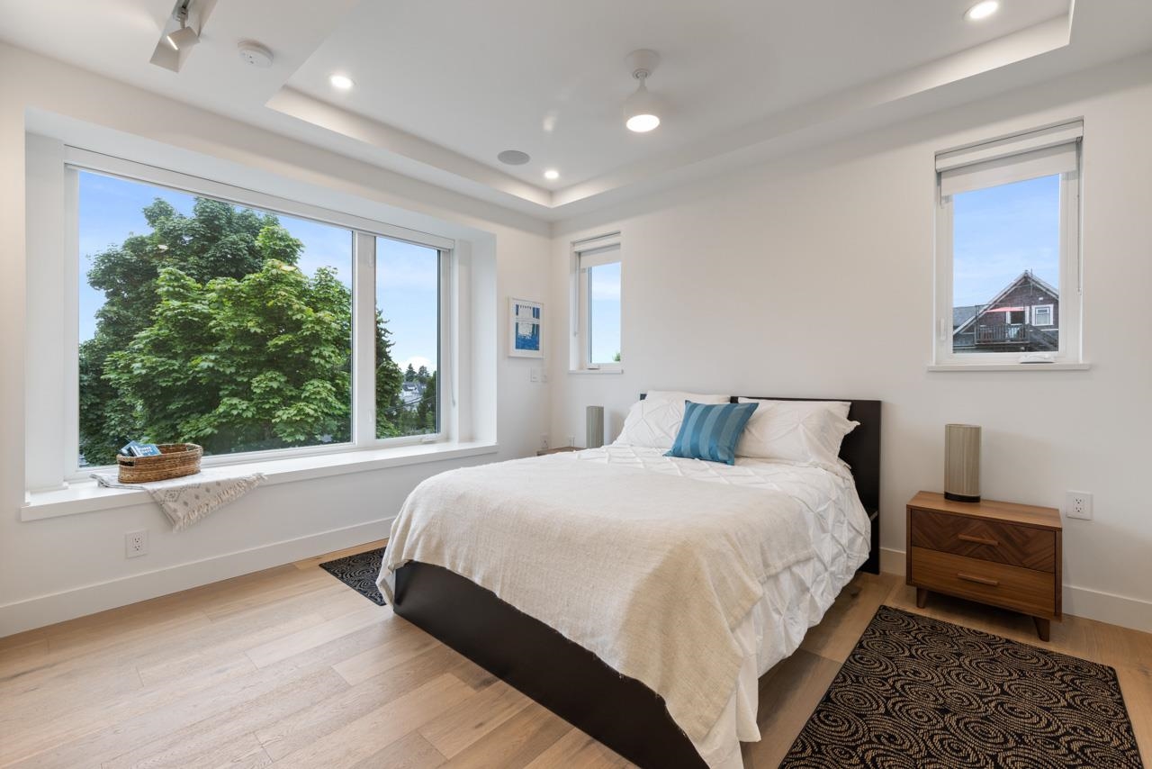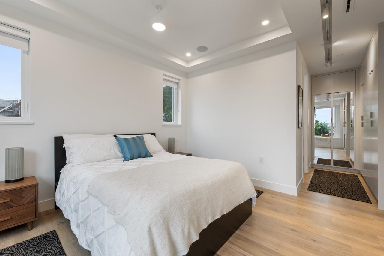 Perched up off the street on a private corner lot, this stunning home lives like a detached house. The main floor has a bright, open plan featuring a living area w/ custom built-ins, stylish powder room w/ Bocci lighting, impressive chef’s kitchen w/ induction range, large island with bar seating and integrated fridge/dishwasher & dining area offering seamless indoor-outdoor flow via 12’ accordion doors to lush the garden & patio. Upstairs has 2 bedrooms incl the stunning primary retreat w/ ample closet space & dreamy ensuite. The top floor bedroom offers a covered balcony, 3pc ensuite & panoramic views. Sophisticated interiors include white oak floors, radiant heat, A/C, Nest system, in-ceiling speakers and custom millwork. Includes a single car garage + bonus secure parking pad. Wow!