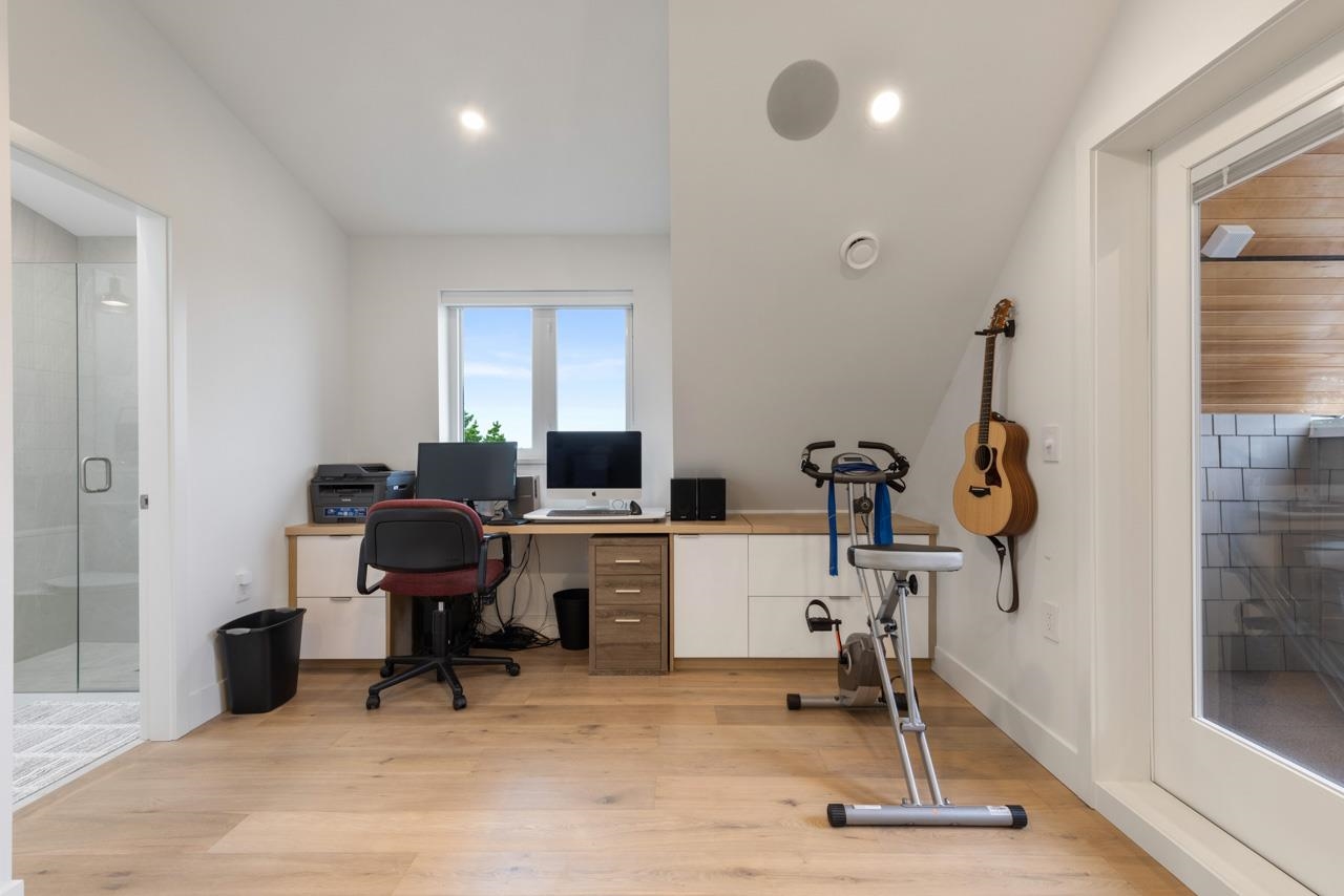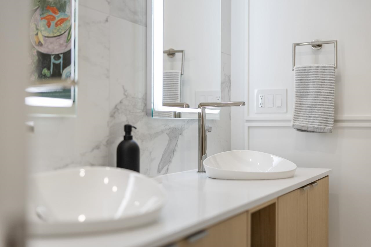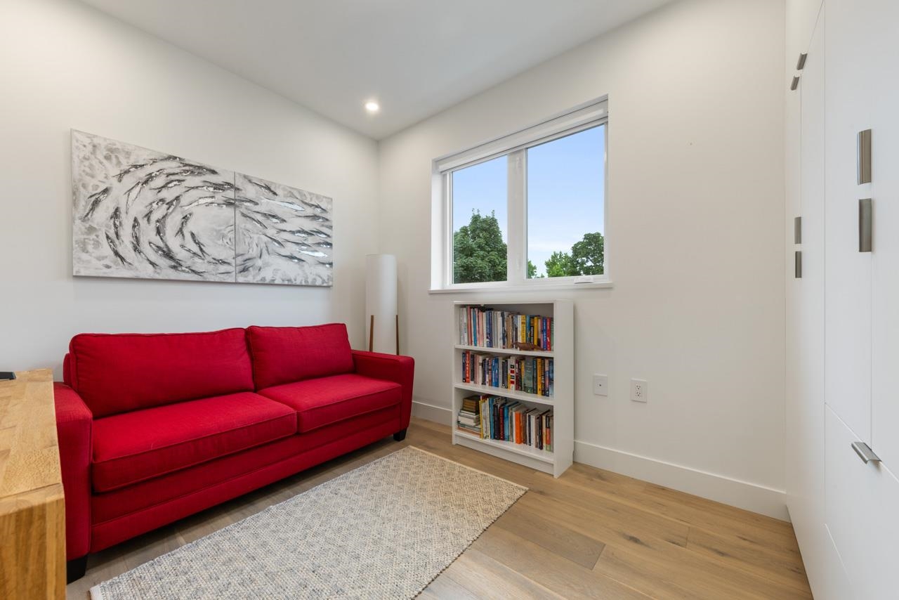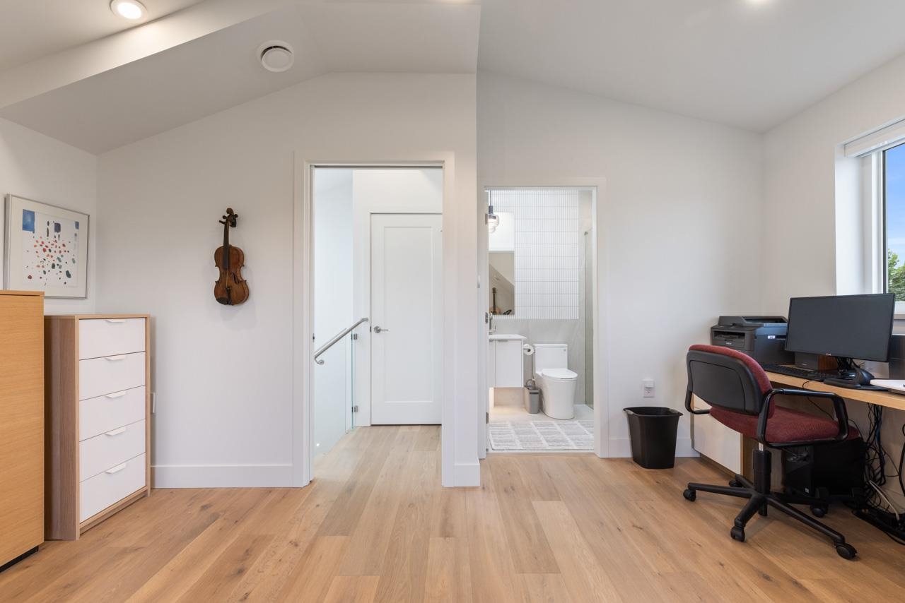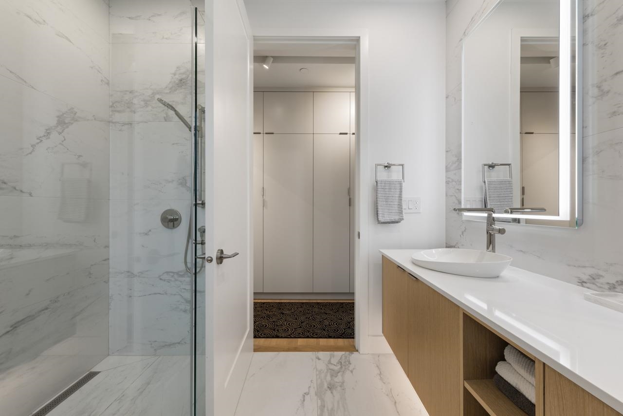 Perched up off the street on a private corner lot, this stunning home lives like a detached house. The main floor has a bright, open plan featuring a living area w/ custom built-ins, stylish powder room w/ Bocci lighting, impressive chef’s kitchen w/ induction range, large island with bar seating and integrated fridge/dishwasher & dining area offering seamless indoor-outdoor flow via 12’ accordion doors to lush the garden & patio. Upstairs has 2 bedrooms incl the stunning primary retreat w/ ample closet space & dreamy ensuite. The top floor bedroom offers a covered balcony, 3pc ensuite & panoramic views. Sophisticated interiors include white oak floors, radiant heat, A/C, Nest system, in-ceiling speakers and custom millwork. Includes a single car garage + bonus secure parking pad. Wow!