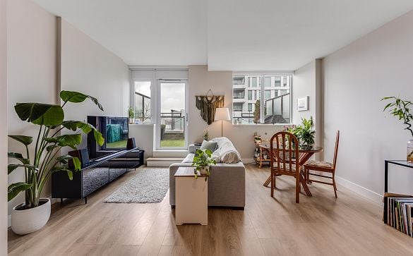 Bright, contemporary 1 bedroom plus den with EV-ready parking stall and storage locker at Paradigm, a concrete riverside tower in River District.... Read More >