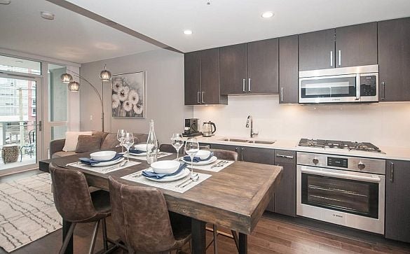 Beautifully UNFURNISHED 1-bdrm + den, 1-bath condo w/ 632 sq.ft. in the heart of Olympic Village. Open layout w/ in-suite A/C, rich hardwood flrs, &... Read More >