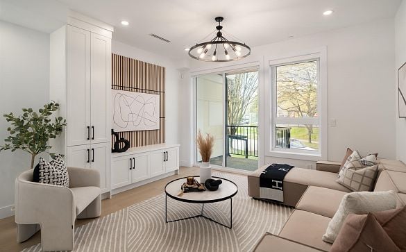 Spacious 817 sq ft corner 1 bed + den in Mt. Pleasant with stunning 180° views. Floor-to-ceiling windows, open concept living space, a large... Read More >