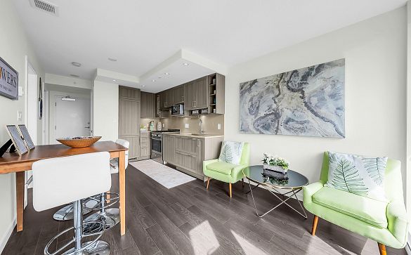 Bright 817 sq ft corner 1 bed + den in Mt. Pleasant with 180° views! Features floor-to-ceiling windows, Corian counters, large island & S/S... Read More >