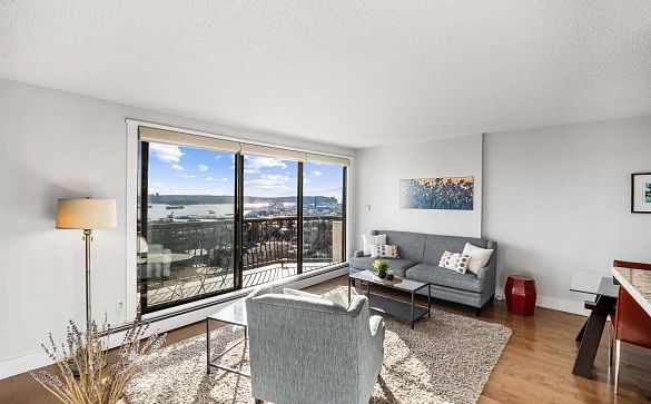Sweeping water, Victoria Park, and Lions Gate view! This spacious 1BR condo has 678 sf with a bright living room that leads to a balcony with a south... Read More >