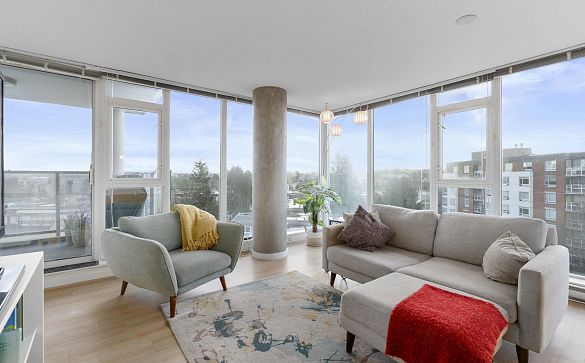 Bright 817 sq ft corner 1 bed + den in Mt. Pleasant with 180° views! Features floor-to-ceiling windows, Corian counters, large island & S/S... Read More >